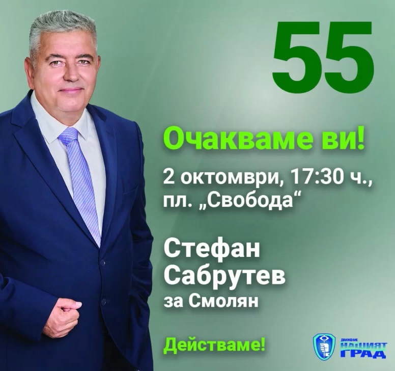 В понеделник, на 2 октомври 2023 година, от 17:30 часа, ще бъда на пл. „Свобода“ в Смолян, където заедно с колегите от нашата листа за общински съветници, както и кандидатите ни за кметове на кметства, ще очакваме всеки един от вас, за да си поговорим за бъдещето на Смолян. Честно и чисто.